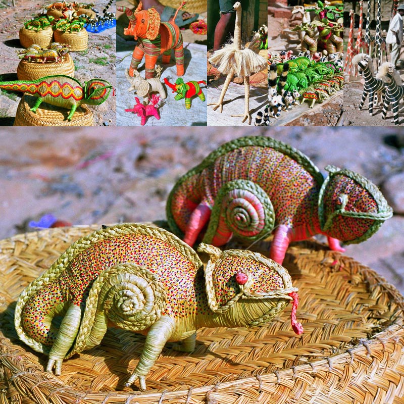 In Madagaskar sind oft ganze Dörfer auf die Herstellung gewisser Produkte spezialisiert. So haben wir eine kleine Dorfgemeinschaft entdeckt, die verschiedenste Tiere und Pflanzen aus Bast herstellt. Lemuren, Chamäleons, Schlangen, Baobabbäume, Palmen, aber auch Tiere vom benachbarten afrikanischen Kontinent wie Giraffen, Zebras, Straußenvögel werden in verschiedenen Größen und mit Fantasiefarben kunstvoll nachgebaut.