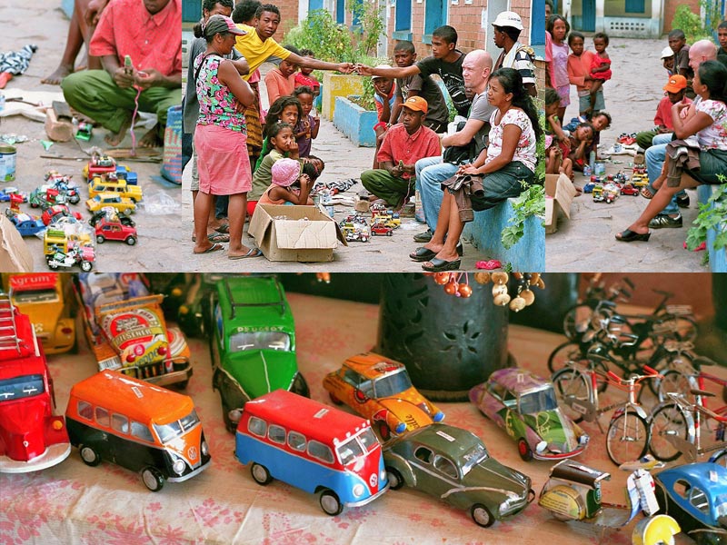 Madagaskar bietet jedoch noch andere Handwerkskunst in großer Vielfalt. Interessant sind hier zum Beispiel Waren, die aus Blech und Metall recycelt werden. In unserem Programm finden Sie eine große Palette an Spielzeugautos, -fahrrädern und –motorrädern, die kunstvoll aus Konservendosen hergestellt werden. Mit diesen Produkten kann man selbstverständlich spielen. Die Autos rollen und meistens lassen sich die Türen usw. öffnen. Es sei angemerkt, dass sie aufgrund von scharfen Metallkanten für kleinere Kinder zum Spielen ungeeignet sind. In der Regel sind unsere Kunden Erwachsene, die sich die aufwändig gestalteten Enten, Käfer, VW-Busse zum Betrachten ins Regal stellen.