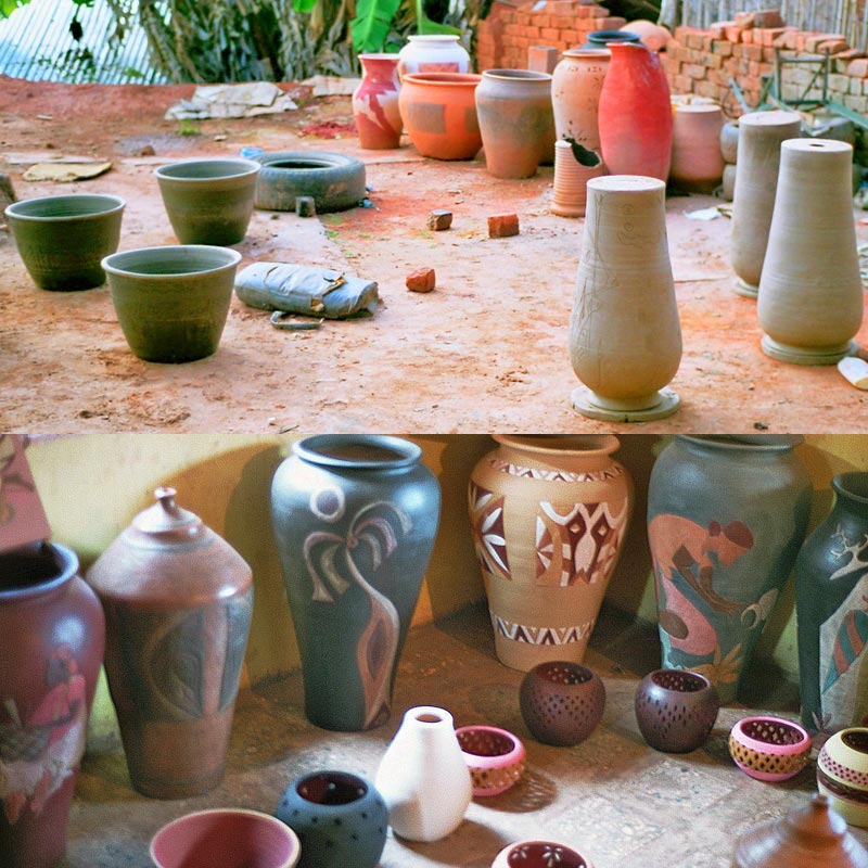 Mit Hilfe unserer guten Kontakte zu Einheimischen haben wir eine aus 2 Brüdern und einer Schwester bestehenden „Mini-Familie“ entdeckt, die Vasen in allen Größen mit kunstvoller Bemalung herstellt. Der Import von Tongefäßen, insbesondere den großen Exemplaren ist nicht ganz einfach. Das Risiko von Beschädigungen im Container ist hoch. Und bedenkt man die Tatsache, dass für jede einzelne Vase als Schutz ein wahrer Holzschrank gebaut wird, so stellt man schnell fest, dass diese Ware viel Platz im Container einnimmt. Wir werden das Wagnis eingehen und wenige exquisite Gefäße nach Deutschland bringen.